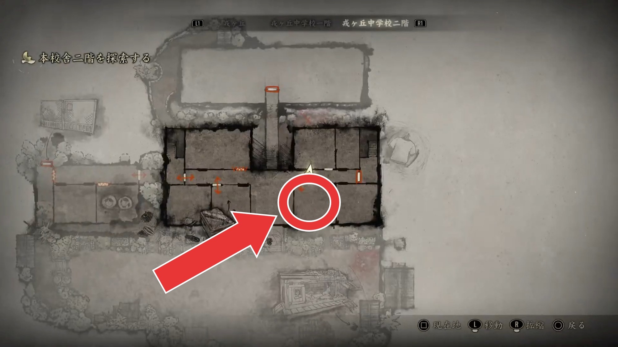 階段で本校者の2階に上がり、「階段扉の鍵」を使用して2階の各教室を調べましょう。本校者2階への扉は東西に2つありますが、どちらから入っても進行は可能です。