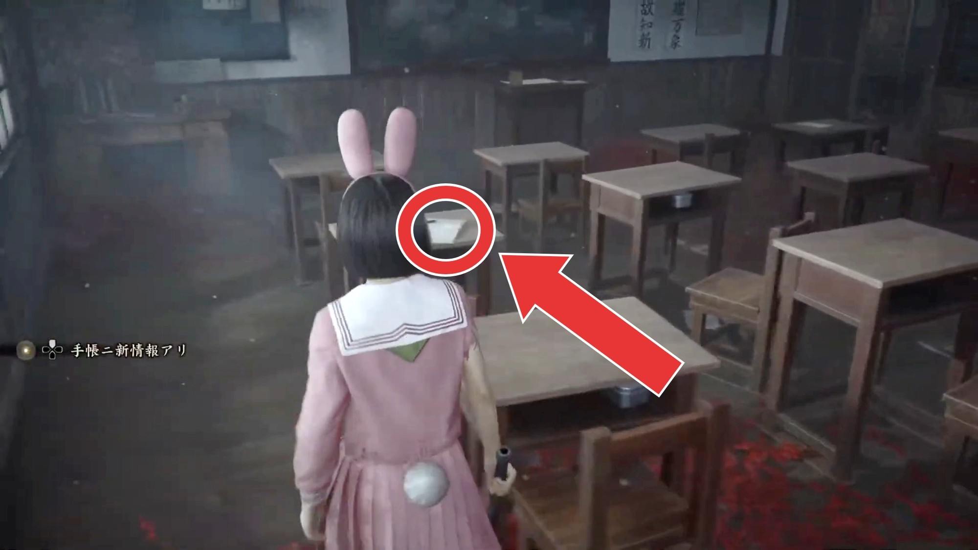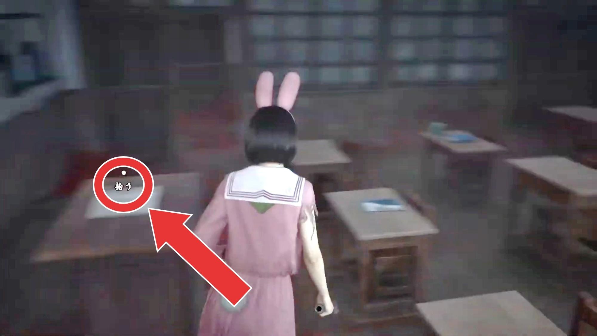 旧校舎の教室の机からは、「女子更衣室の鍵」を入手可能です。旧校舎には他にも謎解きのヒントのメモがいくつか落ちていますが、答えを知っていれば回収する必要はありません。