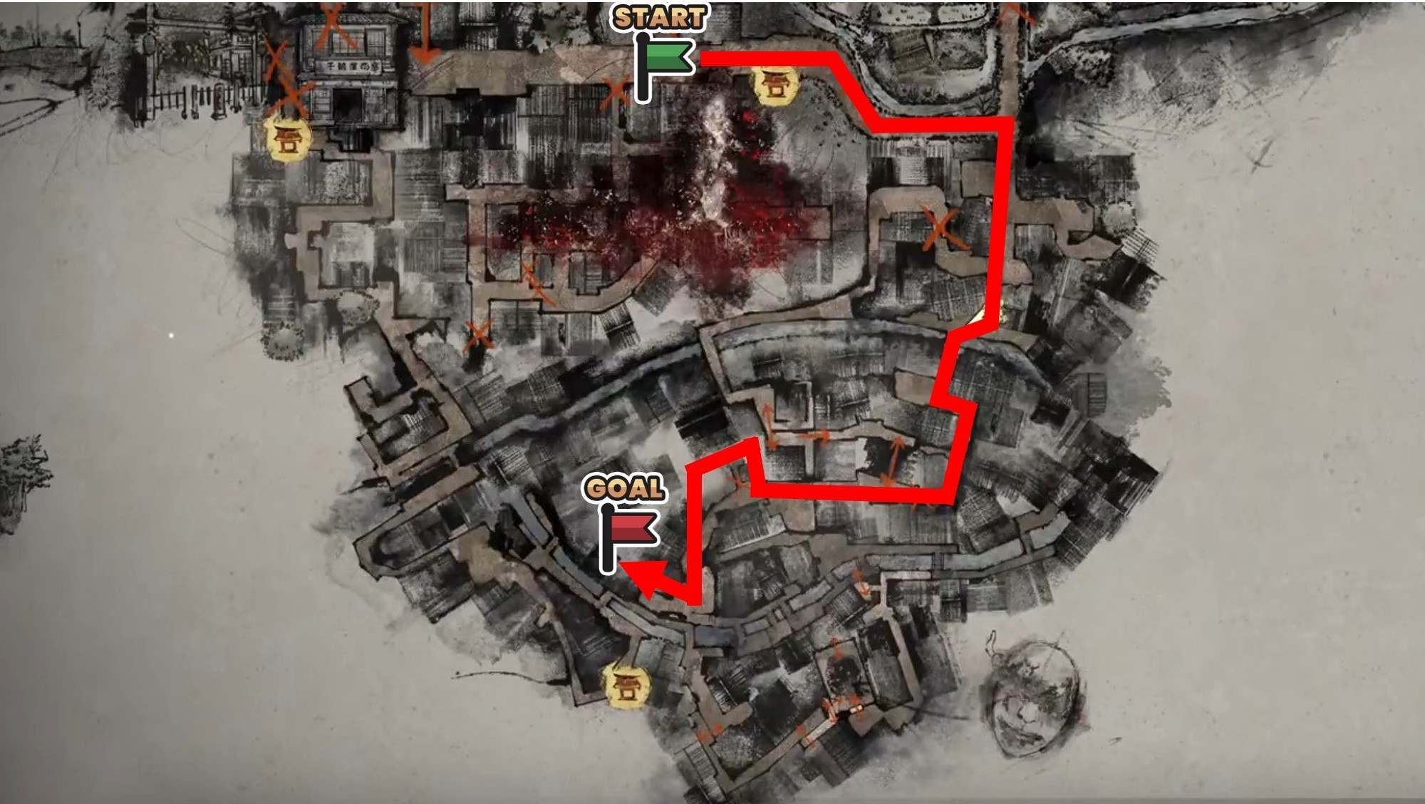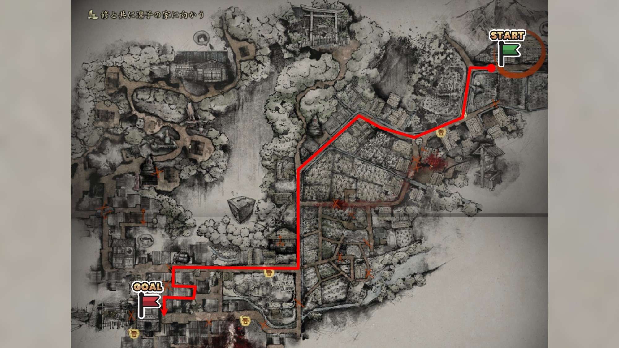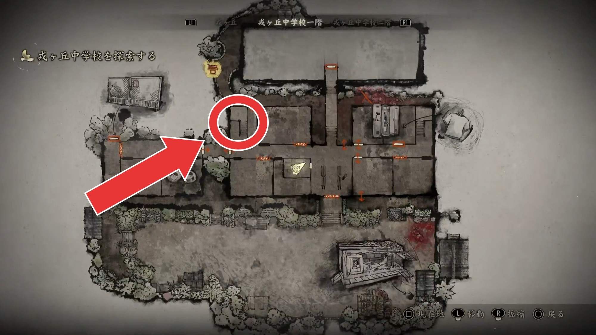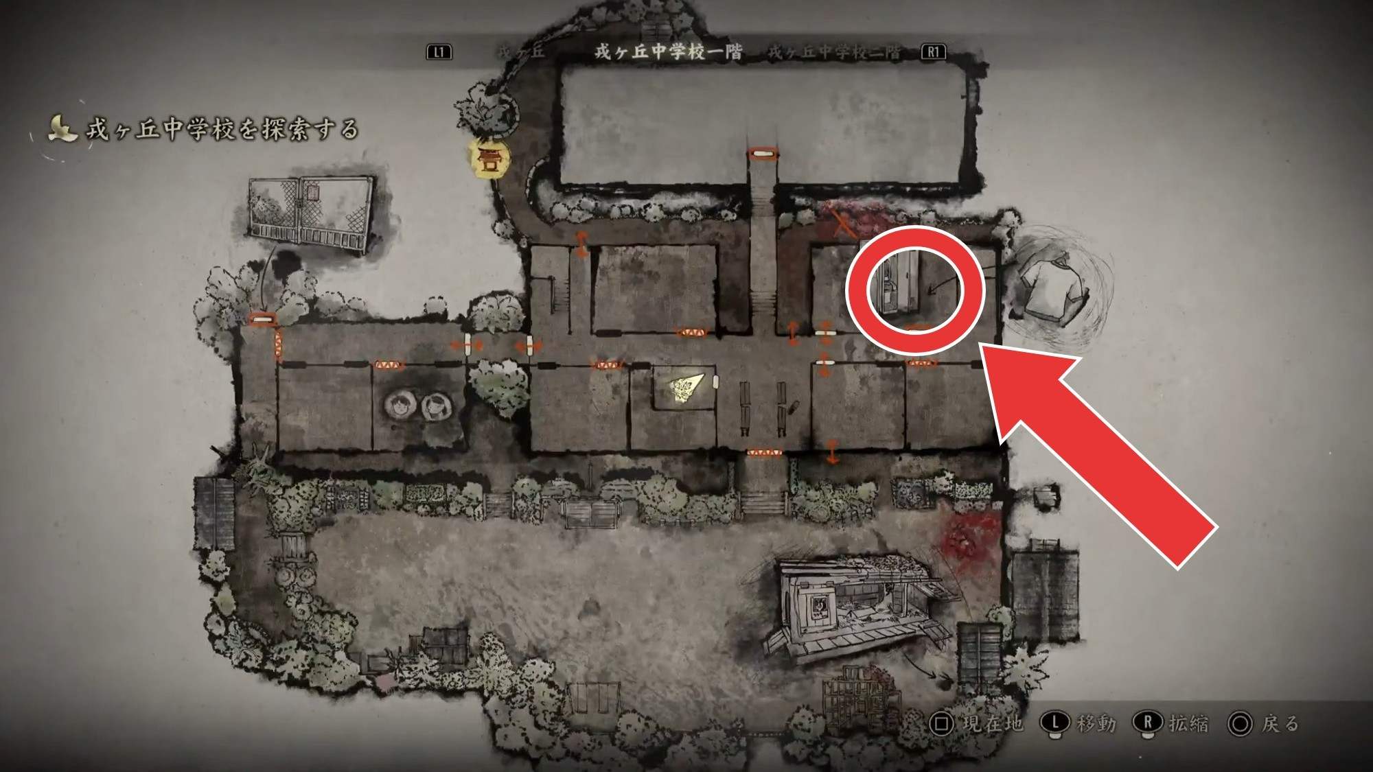 マップの右側を通り、左下方向にある中学校に向かいます。まずは右の道を道なりに進み、突き当たりにある家屋の中を通り抜けましょう。