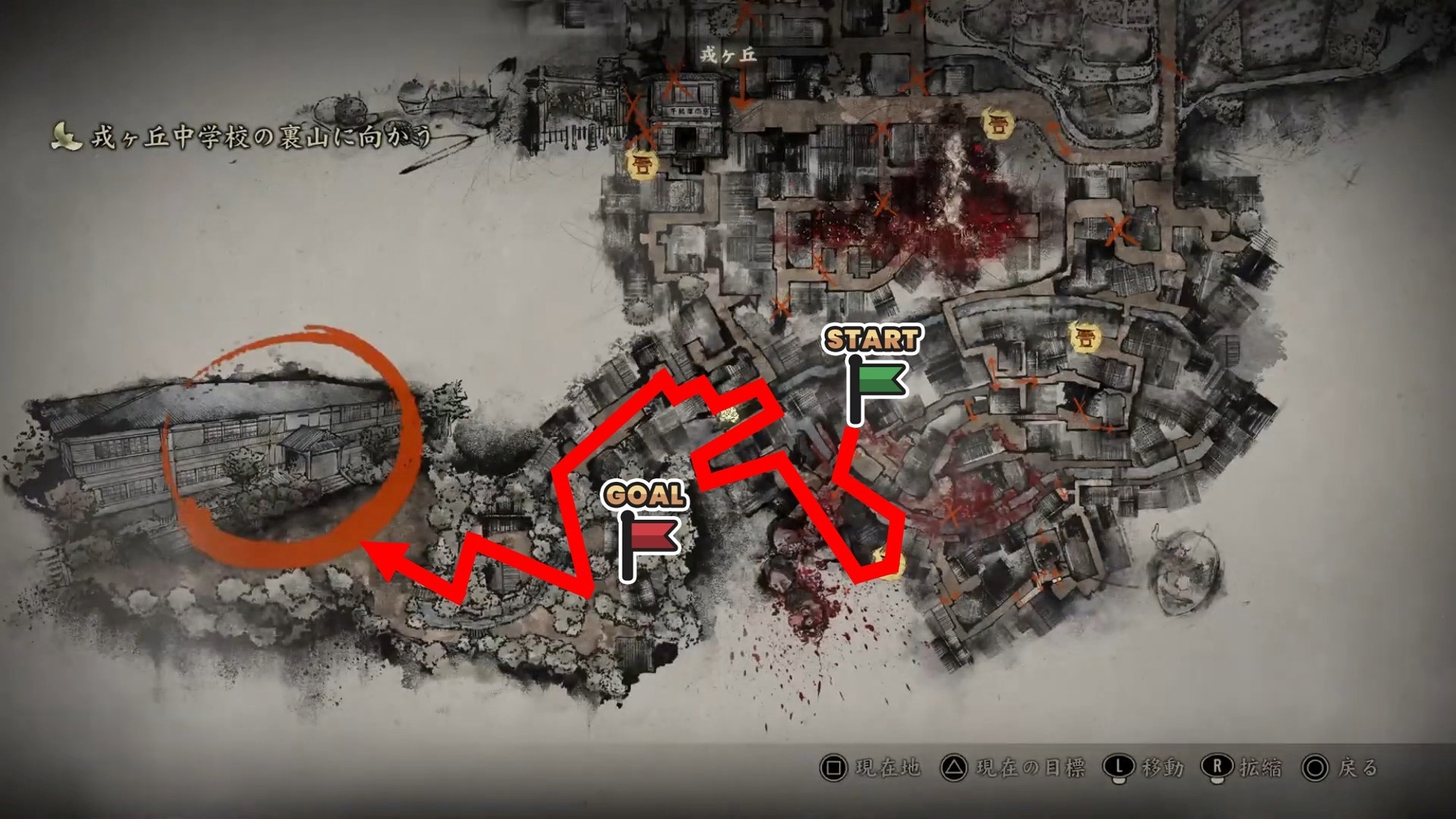 - 右側から迂回して、マップ下の中学校に向かう