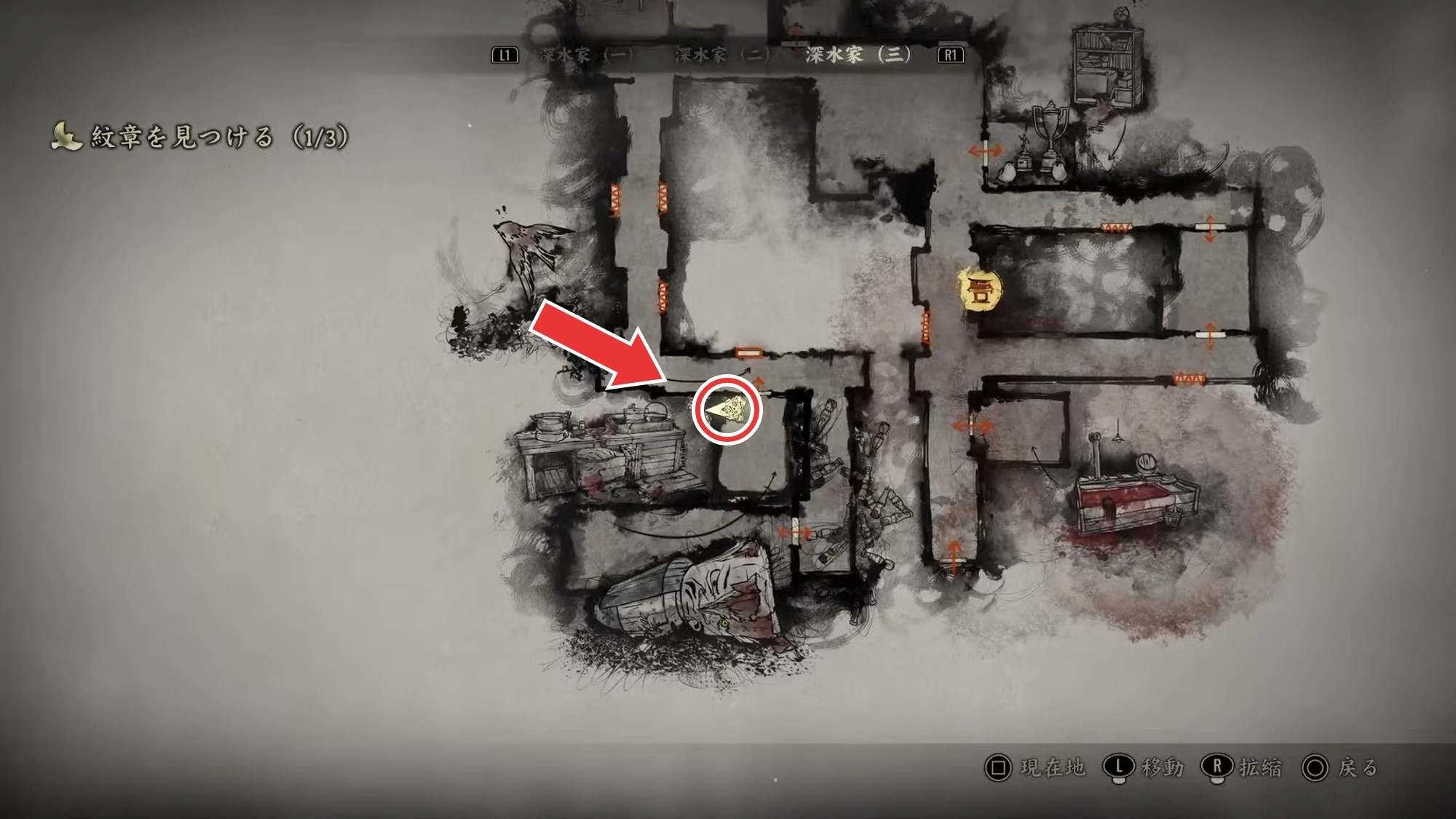 風呂敷は、深水家(三)エリア内南西の台所で入手できます。深水家に到達したら謎を解きつつ、深水家(三)に到達したら取りに向かいましょう。
