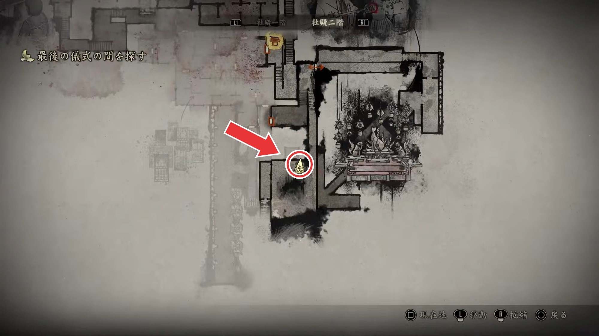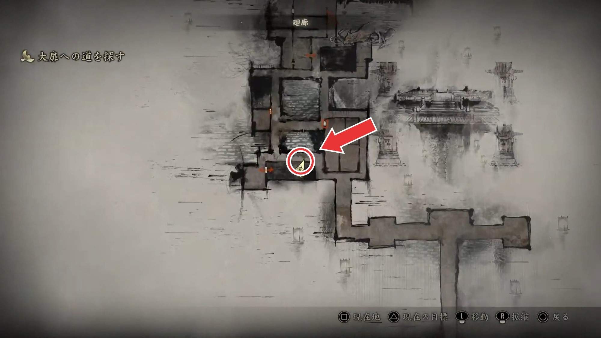 古びた巾着袋は、2つ目の儀式を終えた後に、大広間にて入手できます。大広間は中央が崩れていて通れないため、外周を時計回りに進みましょう。