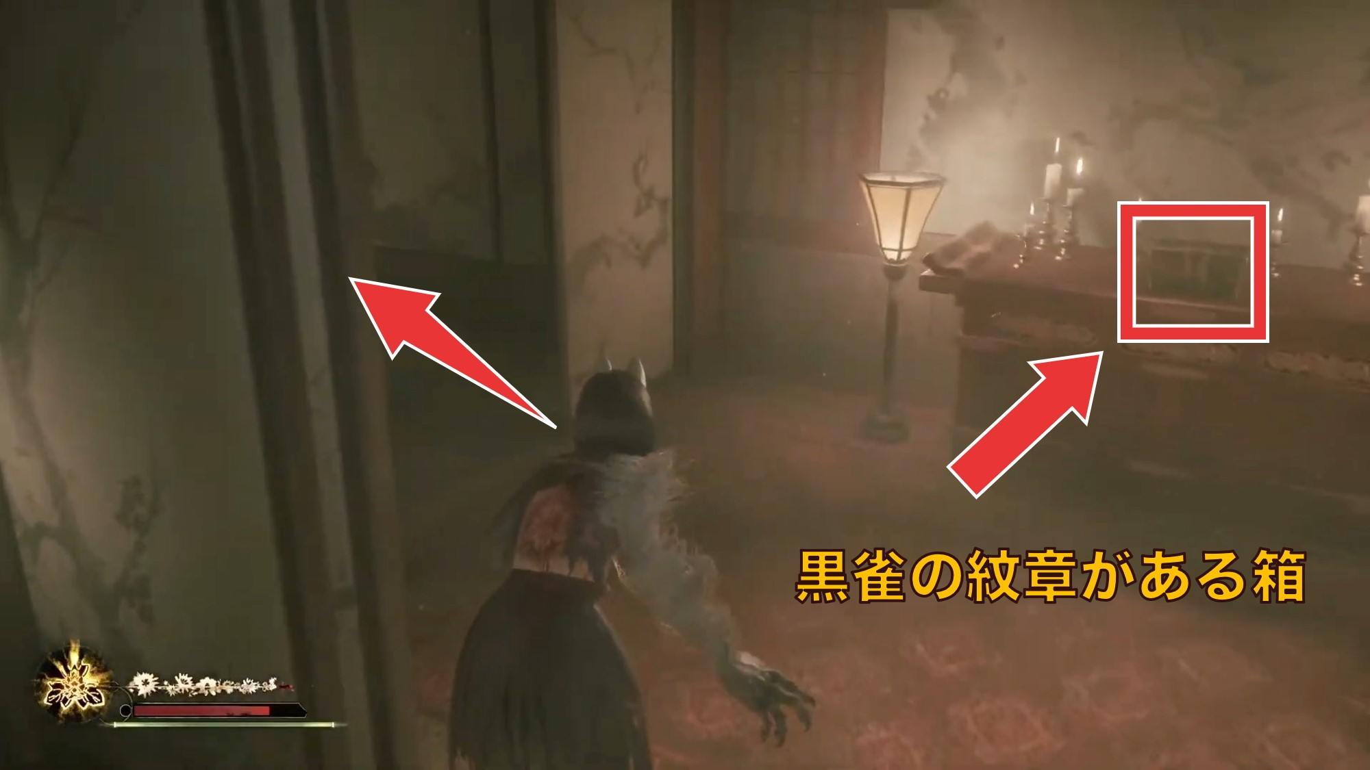 黒雀の紋章がある部屋の隣の部屋に入り、奥にある机の上を調べる |