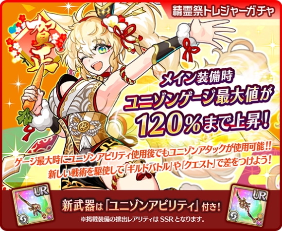 ユニゾンリーグの新年精霊祭トレジャーガチャの当たりまとめをご紹介。ガチャの開催期間や当たり装備の評価と特徴を詳しく掲載。新モンスター「シャンディラ」の詳細もまとめて掲載しています。