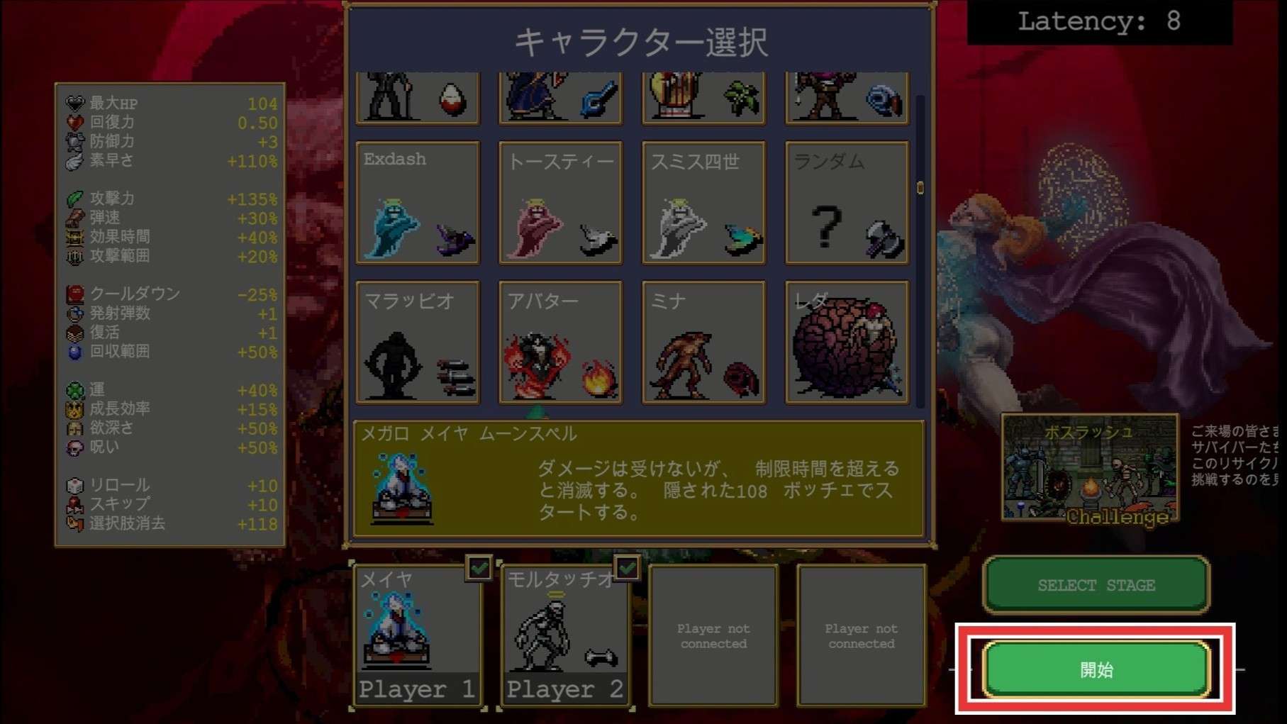 | 6 | ステージやアルカナ等の設定をする場合は「SELECT STAGE」を押下して設定後、「スタート」を押下 |