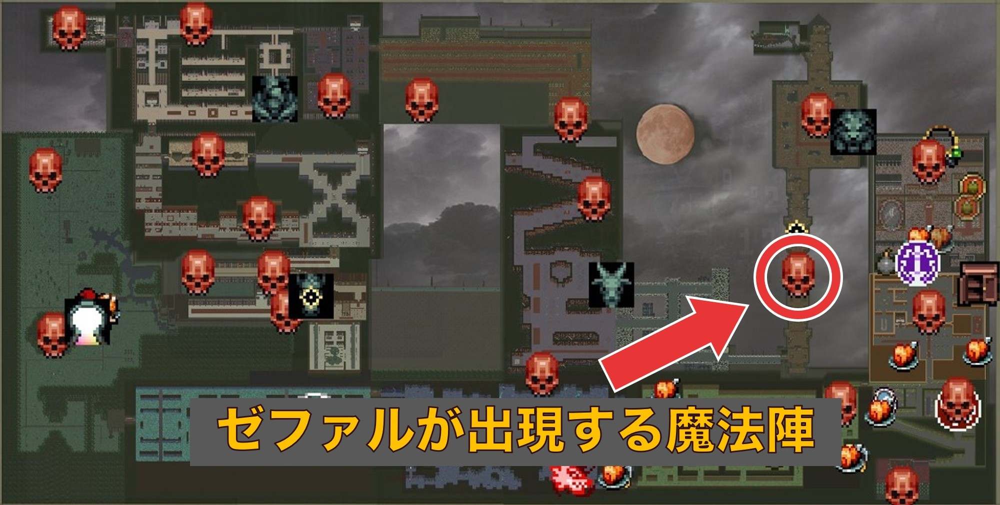 ゼファルの出現場所は、マップ右上「キングゲート」の下にある橋の魔法陣です。魔法陣を誤って起動しないためにも、30分経過するまでキングゲート付近で戦いましょう。
